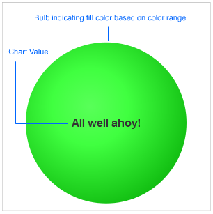 The gauge is defined by minimum and maximum values. Within that scale you can create various ranges to classify your data. Depending on the range that the data value belongs, the bulb color will change and display the value set accordingly.