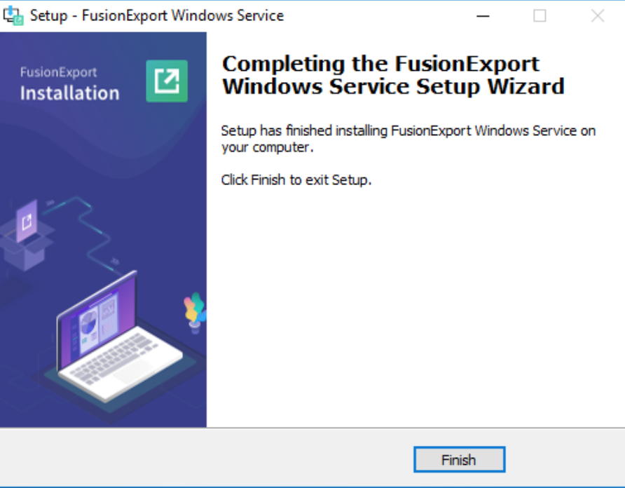 • Once the installation is complete, click on Finish. FusionExport will run successfully on the localhost server.