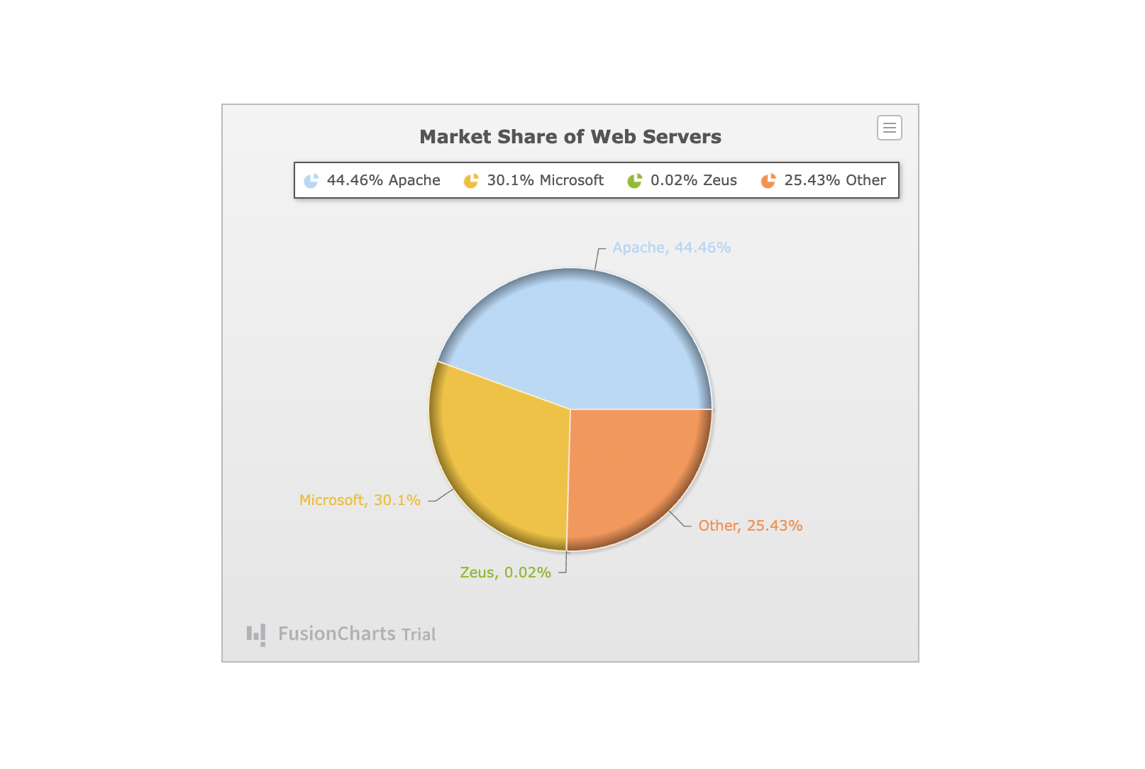 Pie charts are frequently used for showcasing percentages, budget allocations, or market share. Below is an example of a Pie 2D chart.
