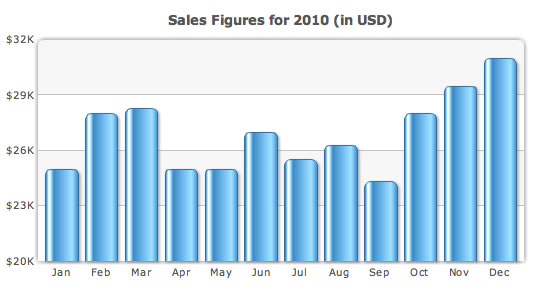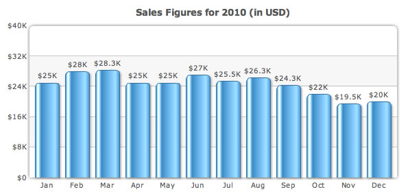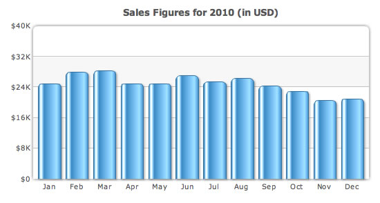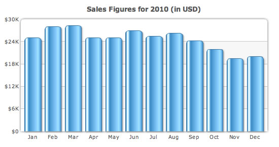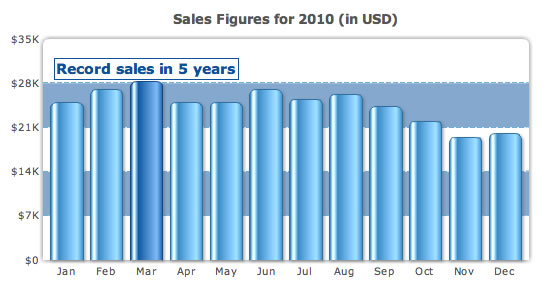 If you are reporting the monthly sales generated by your team in 2010, chances are you would pick a column chart. However, if the performance in the last couple of months has seen a major drop from the earlier months, using a straightforward column chart would clearly reveal this drop in performance.