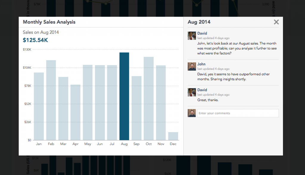 Click on the combination chart (‘Monthly Sales Analysis’): to open a modal window that contains collaboration features (comments and charts).