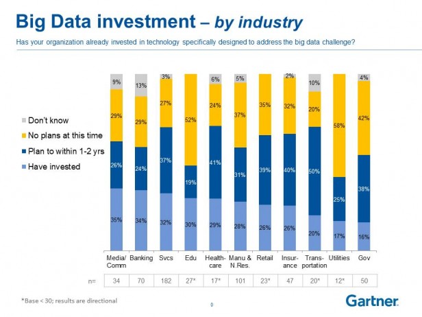 - Big Data – Are we there yet…?This is an interesting, slightly skeptical, read about Big Data. It’s a blog post on Gartner, written by their CEO, Ian Bertram. He questions ‘why call it “Big Data” at all, what makes it big? Rather why not call it just “data” or “Information” as aren’t we just talking about different sources and extracting value from the combination of these sources?.’ He goes on to talk about a study that Gartner conducted last year, that asked people what their biggest issue with big data is, and ‘it wasn’t the volume of data that was the issue, it was the variety, such as video and audio, that dominated.’ I find it ironic that the company that coined the phrase ‘volume, velocity, and variety,’ blowing the bullhorn for Big Data about a decade back, and even staked their claim over the phrase when others used it, are the very same ones questioning the hype around it.A Gartner statistic, which is actually the purpose of the post, shows that the media and communications industry has invested most in Big Data.