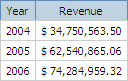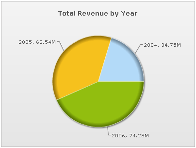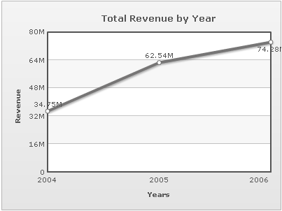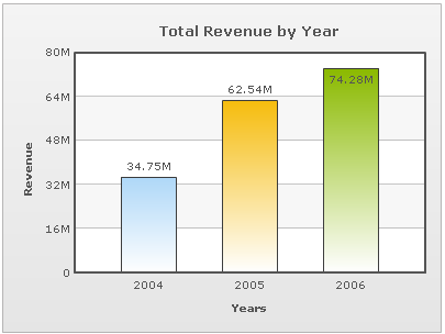 (“<chart caption=’Total Revenue by Year’ xAxisName=’Years’ yAxisName=’Revenue’ inThousandSeparator=’,’><set label=’2004′ value=’914,352,803.72’/><set label=’2005′ value=’1,159,195,590.16’/><set label=’2006′ value=’1,495,891,100.9’/><set label=’2007′ value=’1,117,336,274.07’/></chart>”);