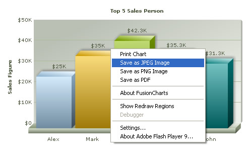 Now, FusionCharts by itself cannot directly export the charts as images. It needs help either from server-side scripts, or other client side Flash movies (coded in Flash 10) to accept the bitmap snapshot sent by FusionCharts, and to convert that into an image or PDF. These are called FusionCharts Export Handlers.