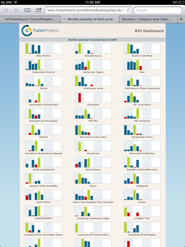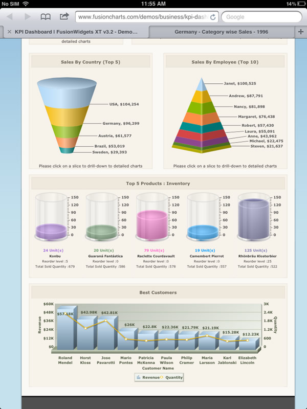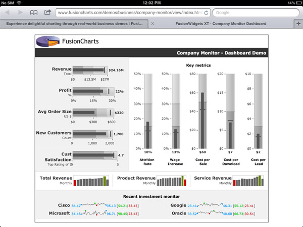 All the gauges, funnel and pyramid charts, sparklines and bullet graphs that you have been relishing till now in Flash are now available for your use in JavaScript, enabling you to build dashboards that now work seamlessly on iPads and iPhones as well.