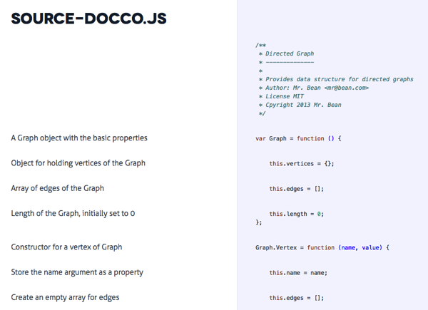 This is where we found Docco to be severely lacking. Docco is built from the ground up for good-looking documentation – easy and fast. It will parse any comment line beginning with double slashes and place it alongside the actual source code in the output.