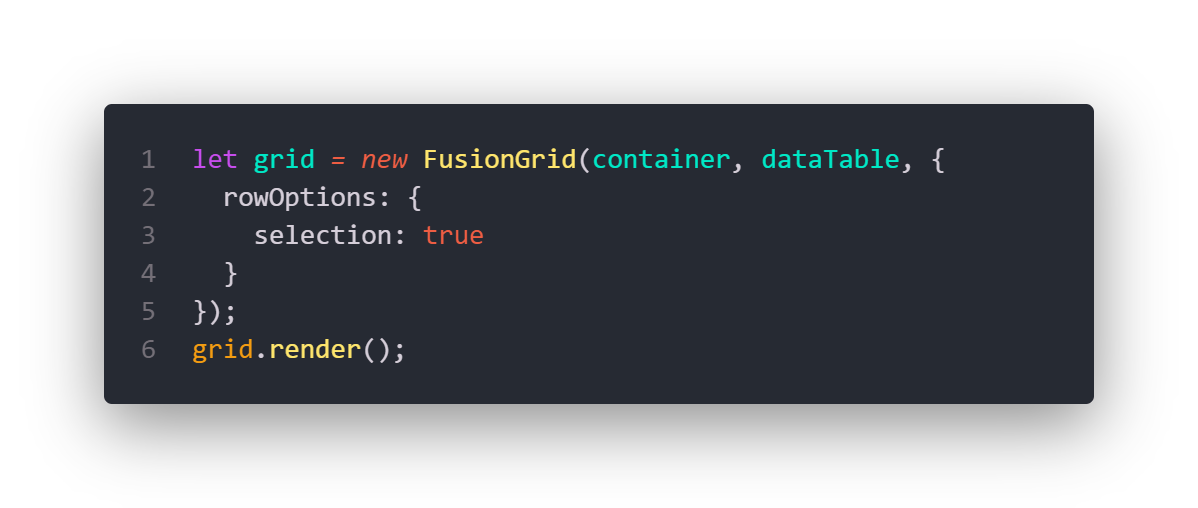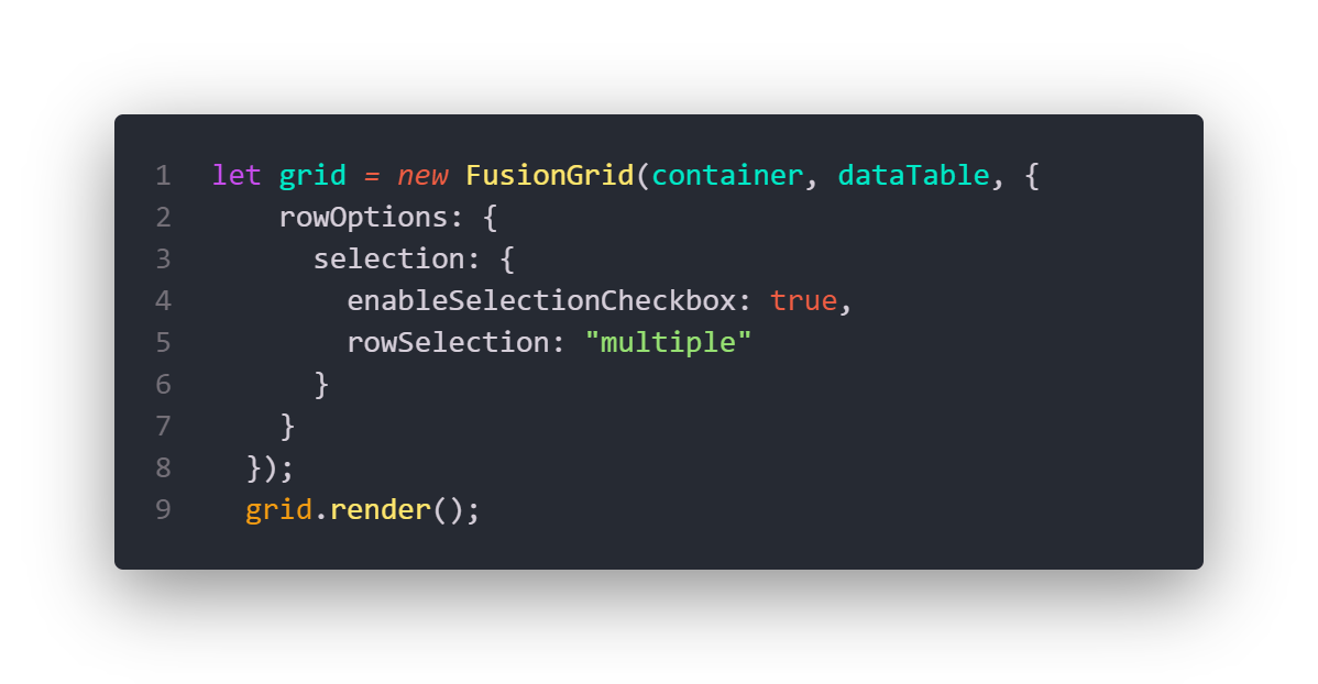 Adding more features to your FusionGrid is also intuitive and easy. For example, when you need selectable rows, just enable row selection. If you want multiple row selections with checkboxes, add just another two lines of code and you have that feature in your FusionGrid. This blog post covers only a couple of the features the new grid has to offer. We encourage you to look at the examples and detailed explanations of each feature on the FusionGrid product page and in our easy-to-follow FusionGrid documentation. We hope you enjoy exploring everything FusionGrid has to offer. Give it a try and tell your friends if you like it!