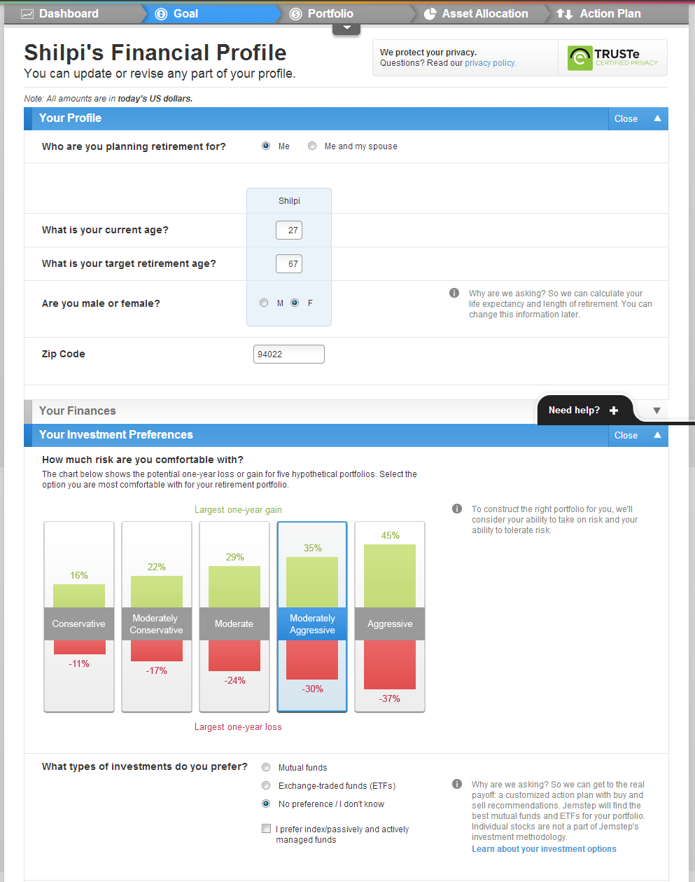 Jemstep also provides an explanation adjacent to important labels explaining users why they need the specific information and how will it be used to help them plan out their portfolio. Nice way to build trust amongst its users by removing doubts from their minds and for an investment app, thistrust really matters!