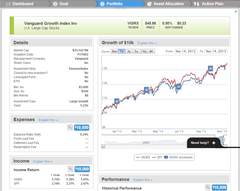 A process of gradual reveal is followed where you can get more information about a particular account type (or a particular asset class) by clicking on the plus symbol adjacent to each account. You can further drill-down into the details of each asset by clicking on it. Let’s say we click on 401K Account > Vanguard Growth Index Inv. You get the complete details about Vanguard Growth Index Inv including their tax efficiency, performance, risk involved, etc.