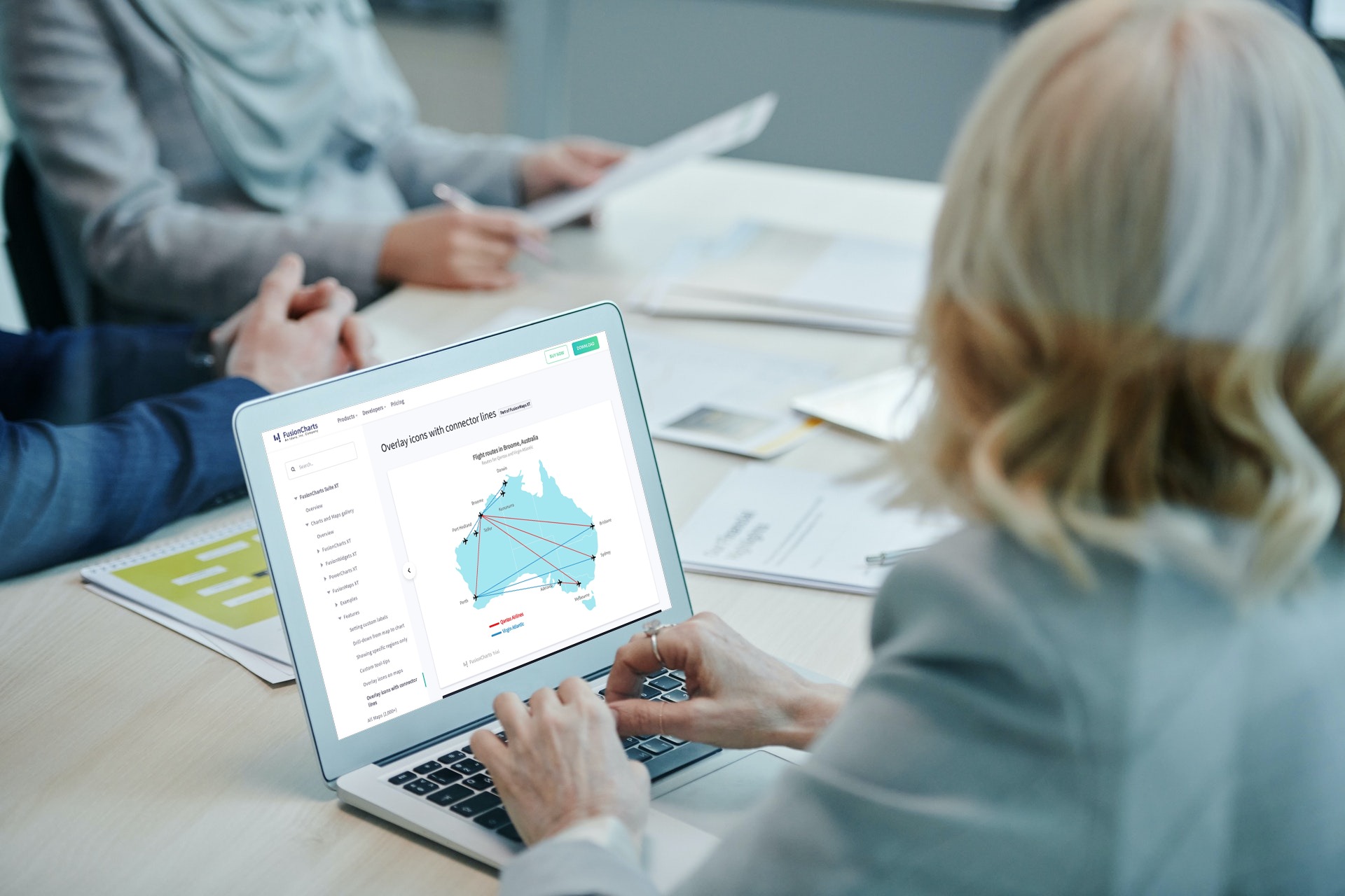 On FusionMap templates, icons mark your regions of interest. The icons are on a separate layer from the map to make them easier to identify, especially with a zoomed-out map of the continents as opposed to just a single country. Captions and tooltips explain the icons and the insights they provide, whether it is the distance between two cities or the wages of the people living there. Another way to visualize connections between overlay icons is by importing connector lines onto your chart, to show they are related. The lines draw paths from one location to another to help you approximate how far apart locations are. If you were planning a visit to Australia and wanted to choose the shortest flight between two destinations, consulting a map of the flight routes would provide that information.