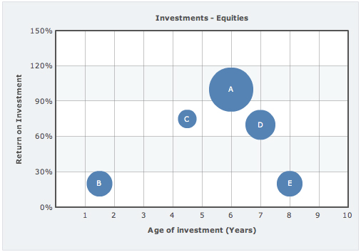 Apart from using bubble charts for investment, there are a whole lot of other places where bubble charts can be used. Some examples to stir up your imagination:- To see if higher promotional expenses lead to more footfall and in turn to more revenue for a bunch of retail stores for a month: The X-Axis can have the average daily footfall, Y-Axis the promotional expenses and the area of the plot will show the revenue generated by the outlet for that month. This can help find out which store was able to promote itself successfully and whose promos failed.
