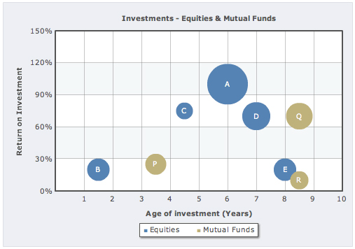 What we have discussed till now are single-series bubble charts. You can also have multiple series of data plotted in the bubble chart. The series will then have different colors with the legend pointing out which color refers to which data series. In our Investments – Equities example, we can also show Mutual Funds in the same bubble chart.