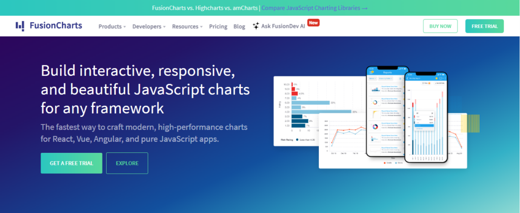 FusionCharts stands out for its dependability, simplicity, interaction, and customization.