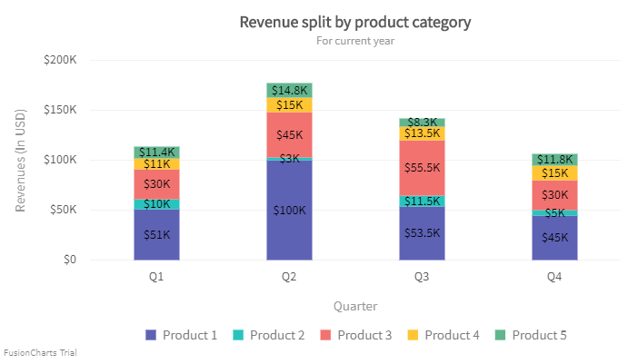 By default, all the data values are hidden for a chart. Setting the showValues attribute to 1 under the chart object displays all the data values in the chart. Given below is an image of a stacked chart, let's see how a stacked chart renders its data values for each data plot: