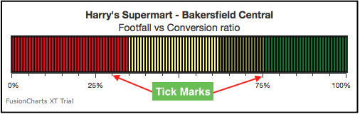Tick marks, an element of gauges in FusionChart Suite XT, are calibration marks on the scale to help interpret readings. There are two types of tick marks: