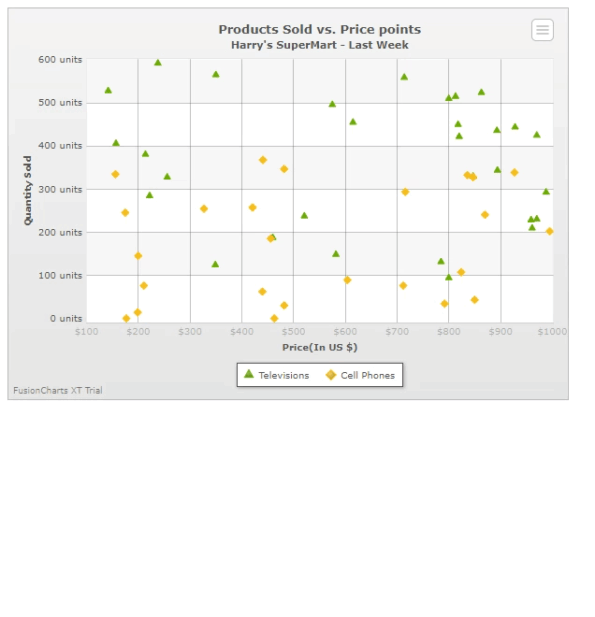This can be used for a variety of purposes, where you want your users to visually select data from the scatter chart. As an example, we will plot a select scatter chart to show the products sold and the price points earned, for televisions and cell phones at Harry's SuperMart in one week.