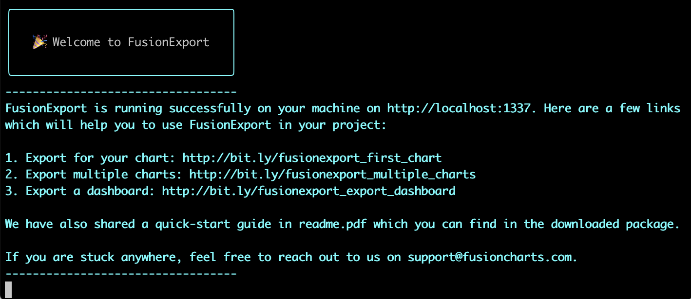 By default, the FusionExport Server starts on localhost, and listens to port 1337. If there are no issues, then you will get a similar message as shown below: