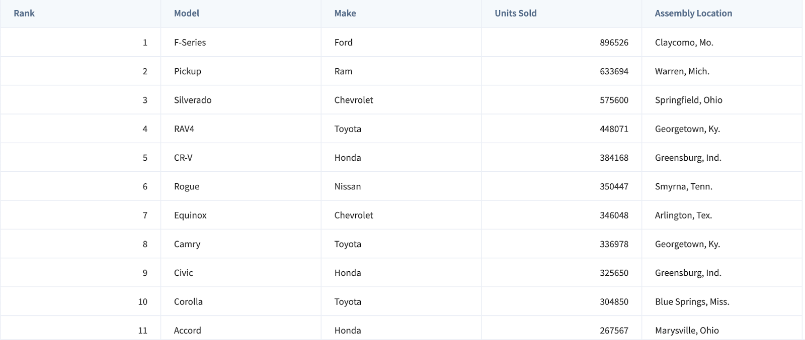 [1, "F-Series", "Ford", 896526, "Claycomo, Mo."],