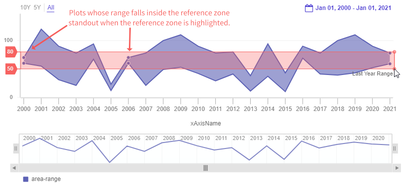 In an area-range series chart, the reference zone only highlights plots when their minimum and maximum values fall between the zone.