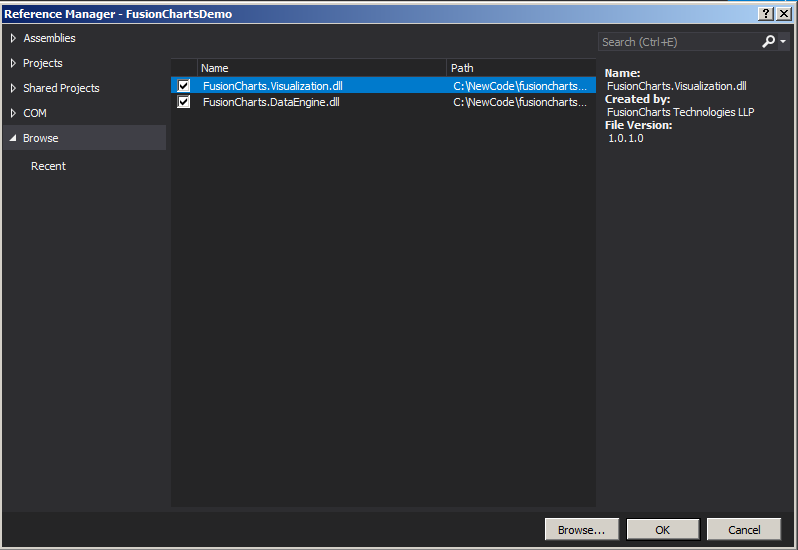 From the Reference Manager window, browse to the FusionCharts.Visualization.dll and FusionCharts.DataEngine.dll files. Add both to the application.