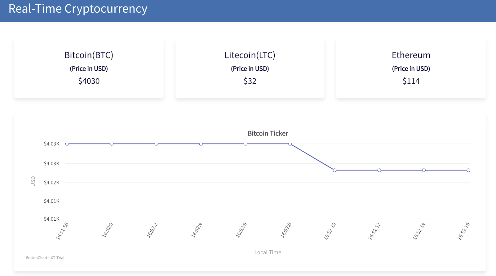 After the successful execution of the code, the page is loaded with the dashboard header, cryptocurrency values and the bitcoin ticker. The Bitcoin, Litecoin and Ethereum prices (in USD) are displayed just below the dashboard header. This Bitcoin Ticker gets updated at a fixed interval of 2 seconds. Hovering on the line chart, at every tooltip the price of bitcoin at that particular timestamp can be observed. The y-axis is configured dynamically in such a way that even with any drastic change in price, the axis of the chart gets modified accordingly. After you have implemented all the steps in this tutorial, your final dashboard will look like this: