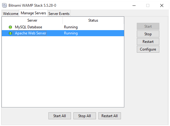 You can manage the MySQL DB server and Apache server by clicking on the Manage Servers tab as shown below: